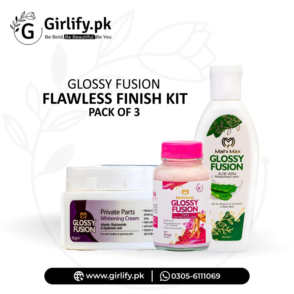 The Glossy Fusion Flawless Finish Kit combines three essential products for a complete skin care routine. The Private Parts Whitening Cream helps even out skin tone in sensitive areas. The Urgent Hair Removal Cream quickly and painlessly removes unwanted hair. The Aloe Vera Moisturizing Lotion soothes and hydrates your skin after treatment.