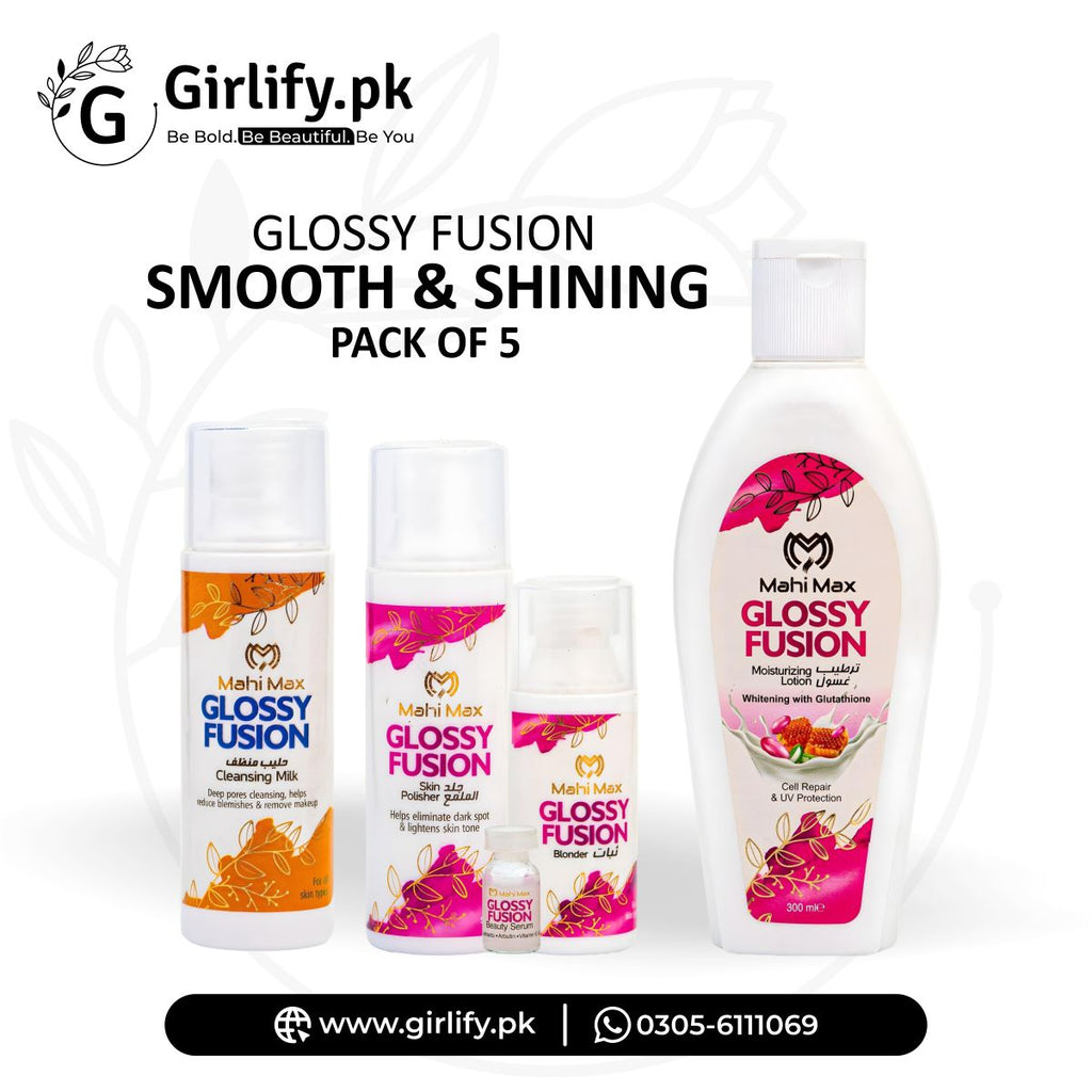 The Glossy Fusion Smooth & Shining Deal is a comprehensive skincare package designed to give you radiant, healthy-looking skin. This set includes five essential products that work together to cleanse, polish, and moisturize your skin: